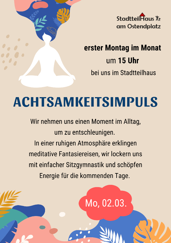 Kommen Sie am ersten Montag im Monat um 15 Uhr ins Stadteilhaus am Ostendplatz zum Achtsamkeitsimpuls. Schöpfen SIe Energie für die kommenden Tage. Das Angebot findet erstmals am 02.03.2026 statt.