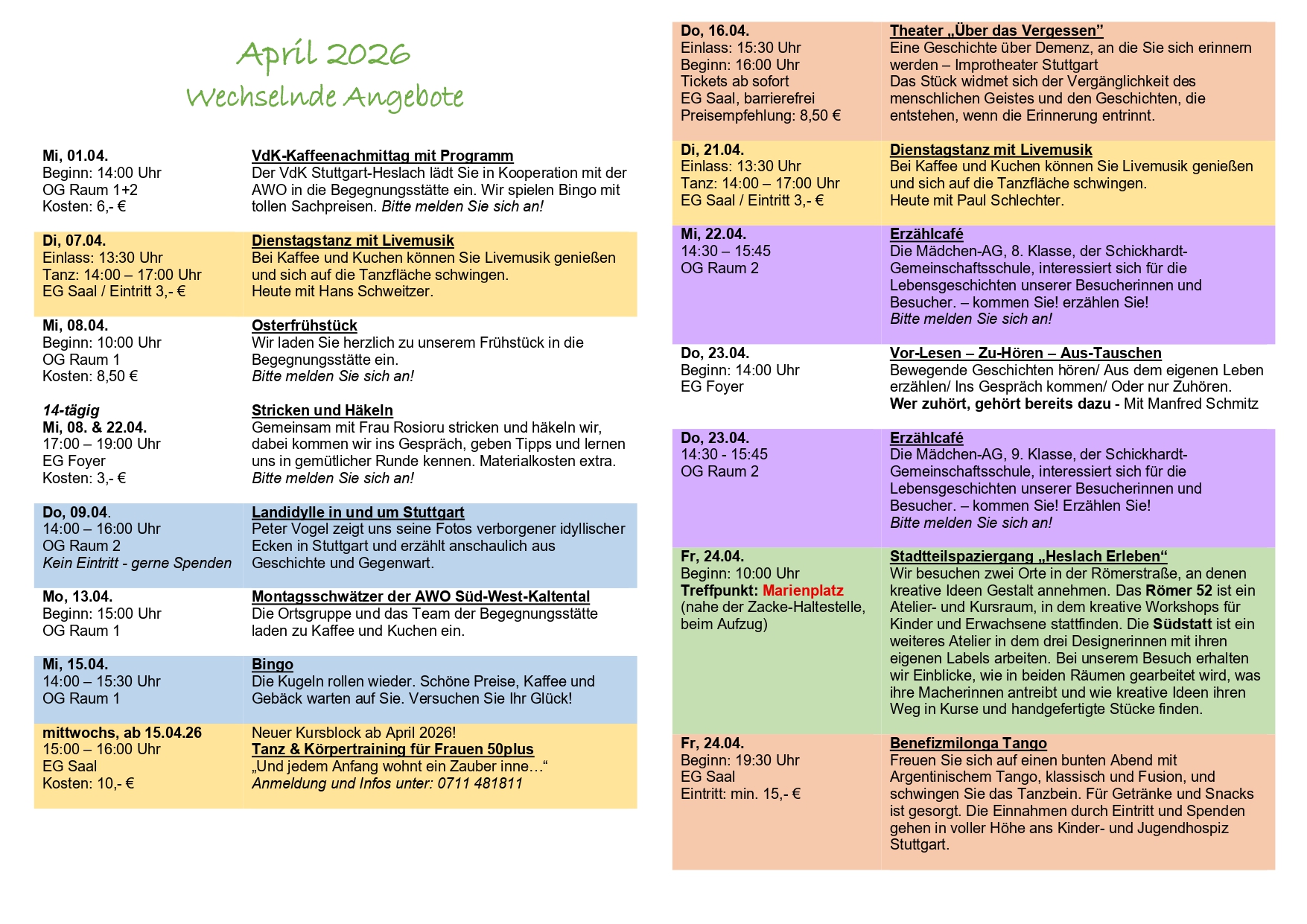 Schauen Sie sich das aktuelle Monatsprogramm des Begegnungs- und Servicezentrum im März und April 2026 an. Wir haben wieder viele abwechslungsreiche Angebote zusammengestellt. Sicherlich ist auch etwas für Sie dabei!