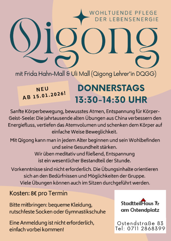 Im Stadtteilhaus Ost findet wieder ein Qigong-Kurs statt. Immer donnerstags von 13:30 bis 14:30 Uhr können Sie Ihr Wohlbefinden und Ihre Gesundheit stärken. Wir freuen uns auf Sie, kommen Sie einfach vorbei.