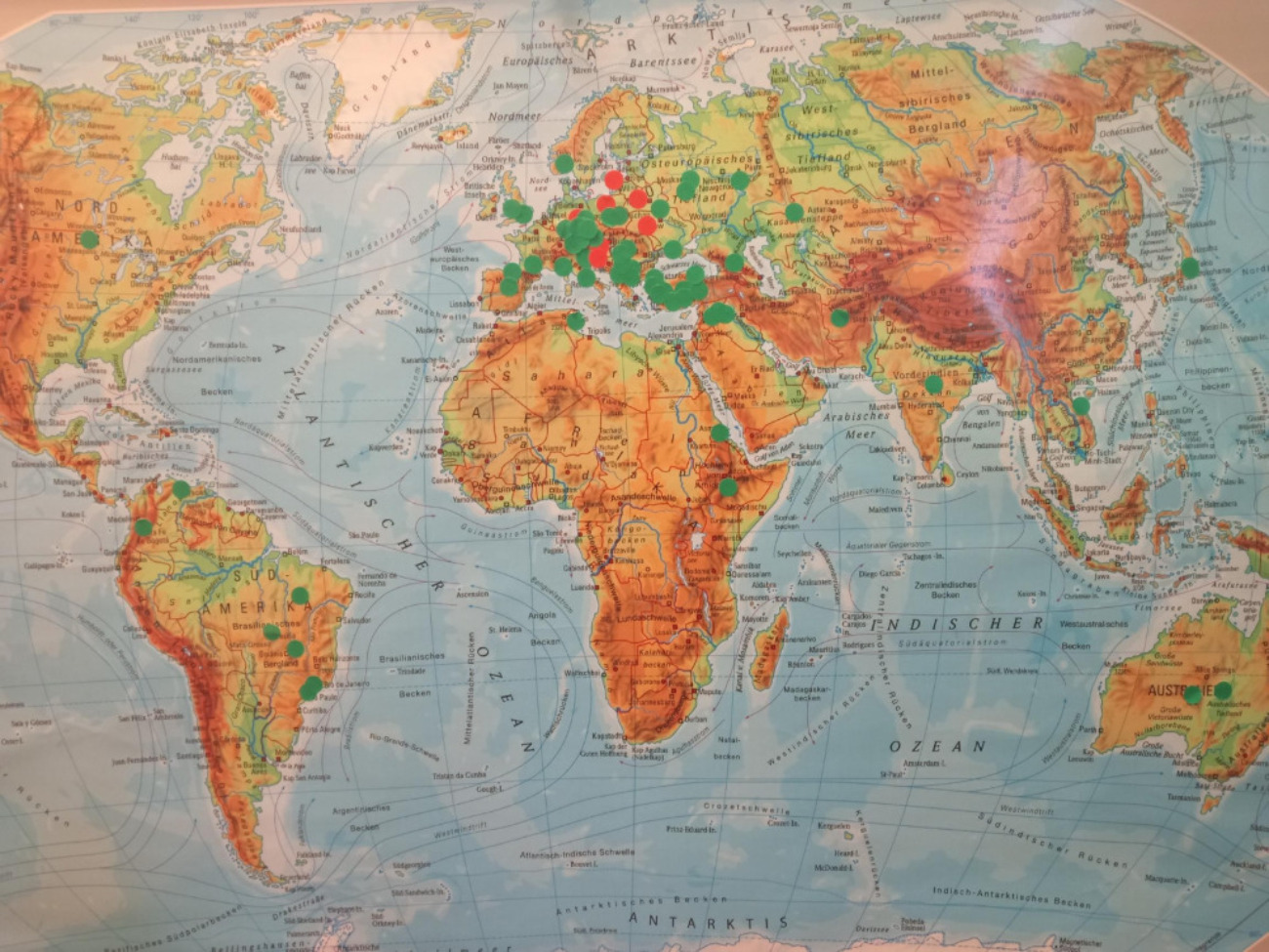 Am Welttag der Migrant*innen und Flüchtlinge (19.01.) wurde an der Grundschule Heumaden eine Weltkarte aufgehangen. Alle Kinder und Erwachsenen konnten mit einem Punkt auf der Weltkarte markieren, in welchem Land ihre familiären Wuzeln liegen. Für die Kinder waren rote Punkte vorgesehen, für die Erwachsenen grüne. Die Kinder klebten mit Stolz ihre roten Punkte auf die Weltkarte und tauschten sich untereinander aus. Viele Kinder waren überrascht, wo die Wurzeln ihrer Freundinnen und Freunde lagen. Am Ende stand eine Weltkarte voller Punkte, die über alle Kontinente verteilt waren.