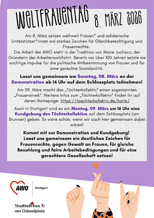 Zudem rufen Sie die Mitarbeitenden in einem Flyer zur Demonstration am 08. März auf dem Schlossplatz und am 09. März zu einer Kundgebung des Töchterkollektivs auf dem Schlossplatz auf. Unterstützen Sie uns und setzen wir gemeinsam ein Zeichen für Frauenrechte und eine gerechtere Gesellschaft.